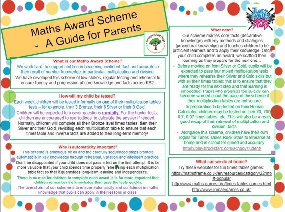 When children enter KS2, children move to Times Tables Rock Stars and begin our Maths Award Scheme. The scheme focuses on developing automaticity in pupils through the accurate and rapid recall of all key multiplication tables facts and related strategies. These build up in difficulty throughout the scheme and cover many of the key objectives for the KS2 arithmetic paper, whilst also introducing some key skills from KS3 to support with transition to high school.